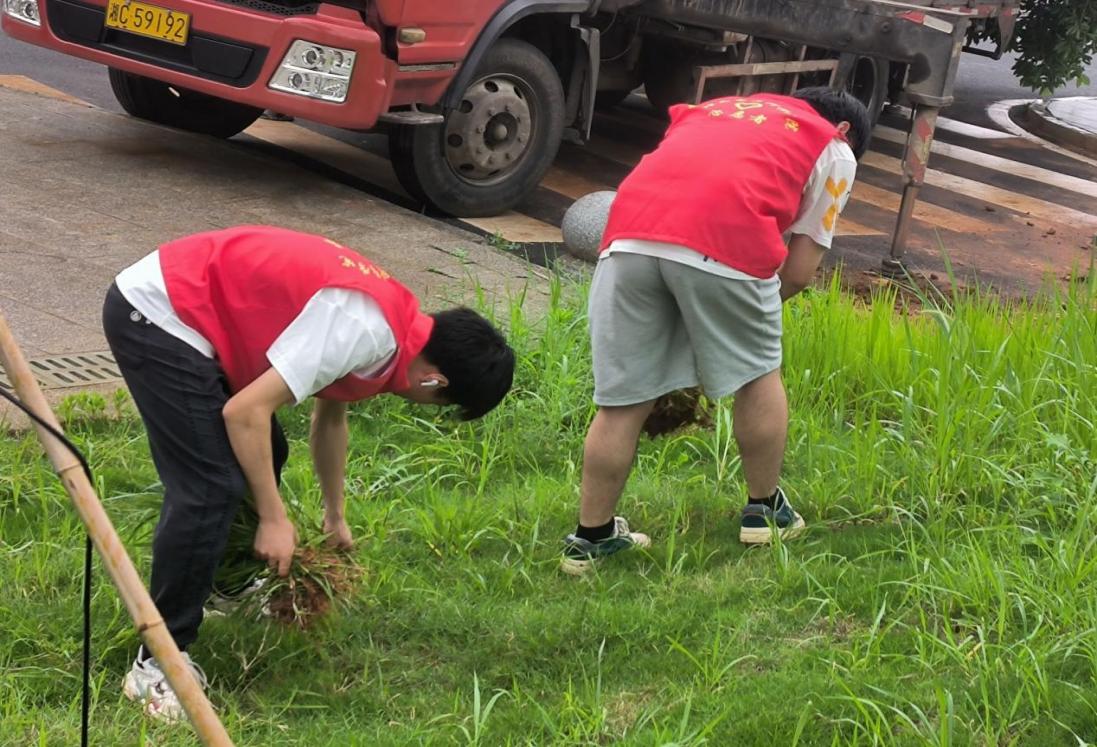 ▲志愿者们正在清理绿化带里的杂草