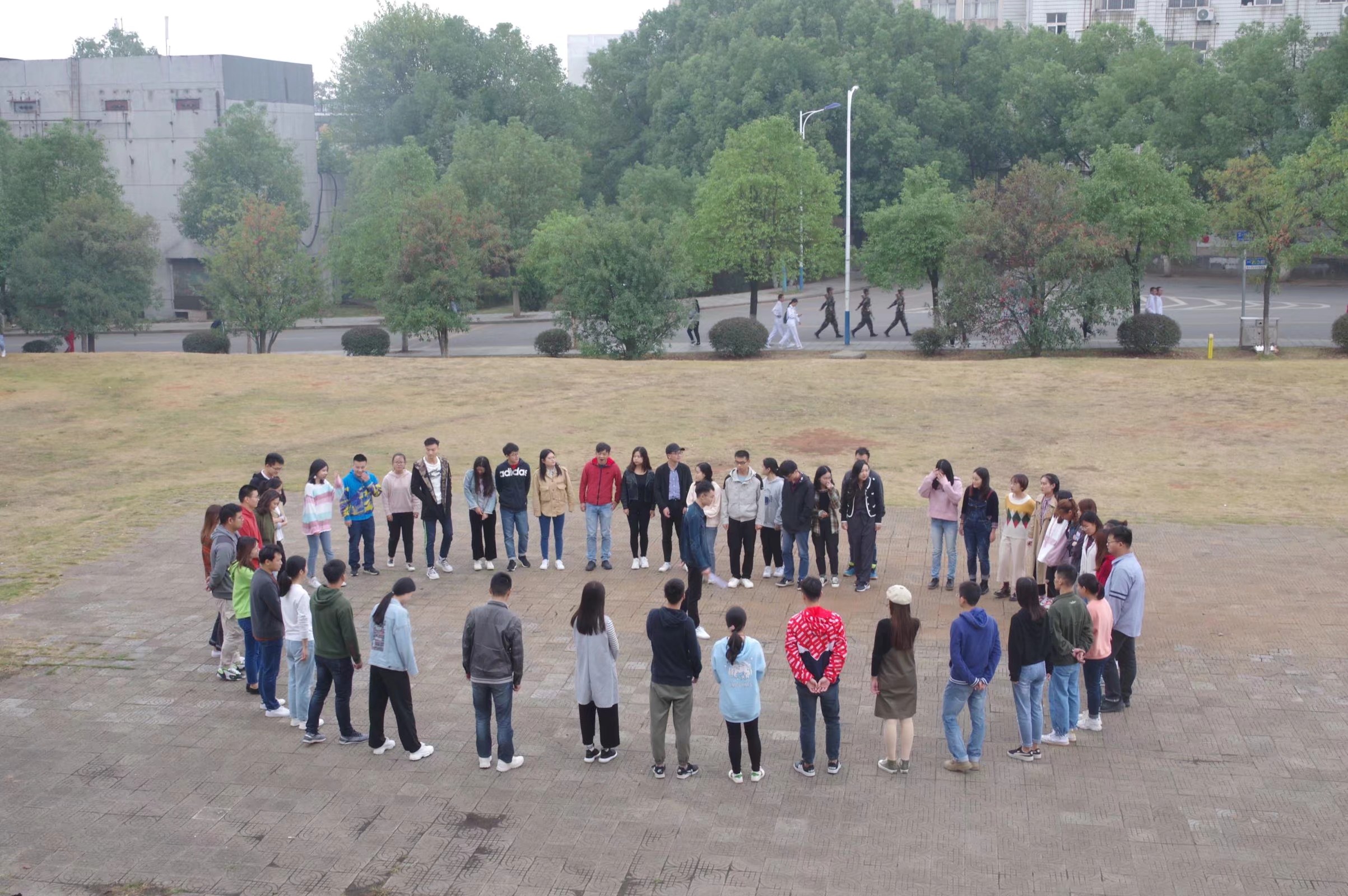 12点30,活动正式拉开帷幕。活动伊始,主持人强调活动以“安全第一”原则,其次呼吁大家在游戏中要做到“忘记身份,忘记性别,忘记年龄”,做到“互相鼓励,互相帮助,互相信任”。得到了大家的积极响应。在几个热身环节后,活动正式开始。活动按照“团队破冰”、“分组团建”、“分组竞技”的顺序有序进行。“团队破冰”环节开始,所有队员以教官为圆心围成一个圆了。接着进行了“阿水的故事”,所有的人都将自己的右手的食指放在右侧,与肩部水平,左手放在相邻的队员的食指上。当队员听到主持人讲到一个“水”字时,队员的左手去抓相邻的队员的右手的食指,左手迅速逃开。几个回合下来被抓到次数的队员接受了惩罚。现场笑声不断,气氛被推向了高潮。接下来所有人被分成了三组,进行“分组团建”环节。分组展示中,各组展示了自己的队名、队旗,并合唱了队歌。一个个各有特色的小团队,为活动增色添彩。“分组竞技”中,各小组展现出了老友般的默契,向着冠军一起努力。
