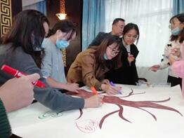随后,70位学员分成7个小组展开行与思团建活动。各位教师以小组为单位,齐心协力设计出风格各异和寓意丰富的小组海报和口号,充分展现了当代教师的风采。