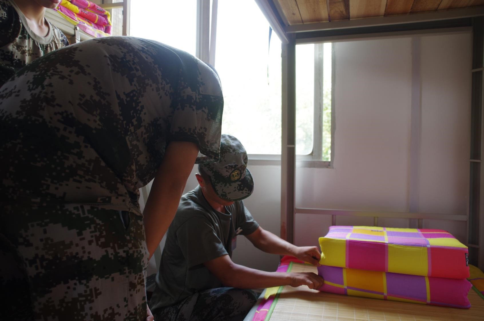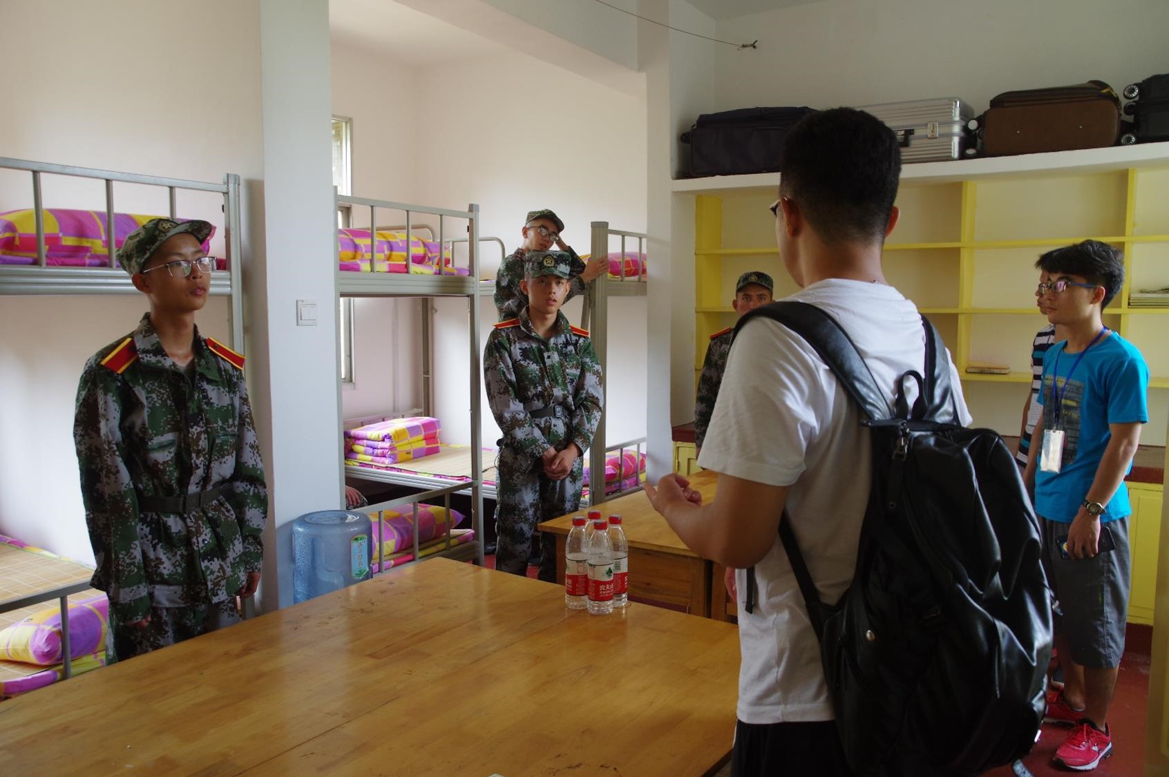 公司领导及军训教官下寝指导内务