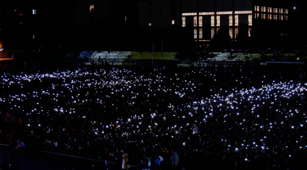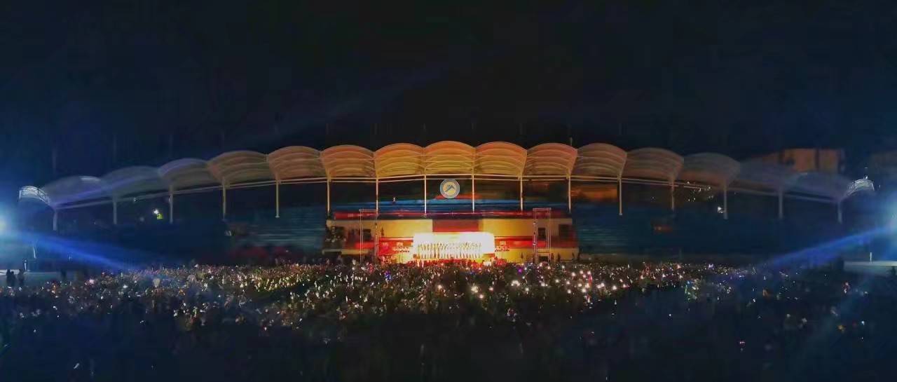 北校田径场夜风徐徐吹起,舞台灯光逐渐点亮,19级新生迅速静下来,9月17日晚7点半,公司“我和我的祖国”新生军训合唱比赛于北校田径场震撼举行。副董事长胡石其、学工部部长尹风雨、武装部部长朱理哲莅临此次活动,并与艺术公司老师共同担任比赛评委。